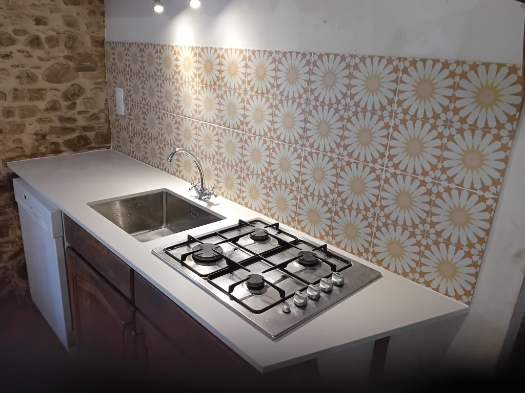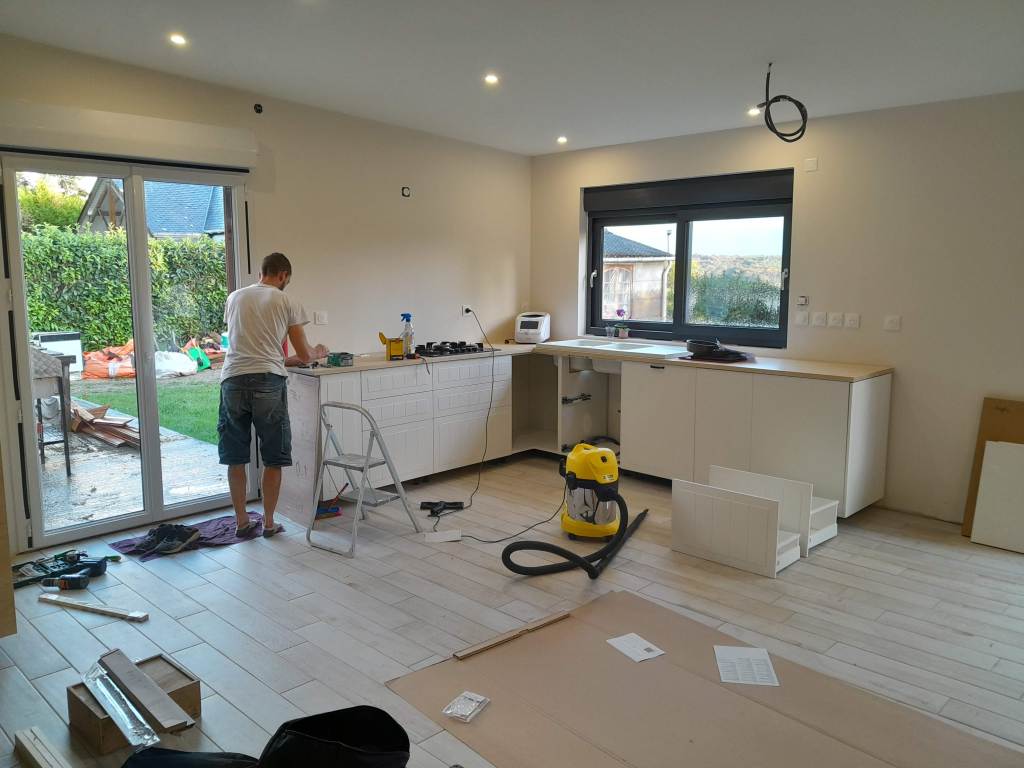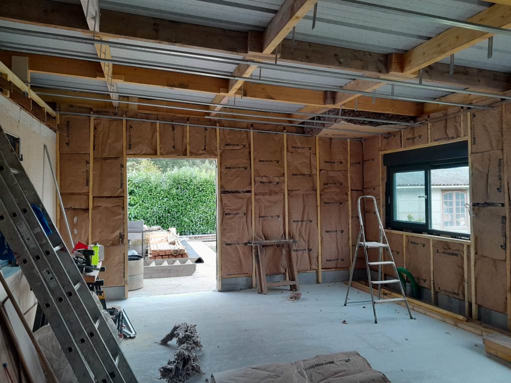 L’espace de vie a été créé dans une extension neuve de la maison d’habitation. Atelier des Vallons s’est occupé de l’isolation, de la pose des plaques de plâtre, ainsi que de la pose de la cuisine (meubles, plan de travail et crédence).