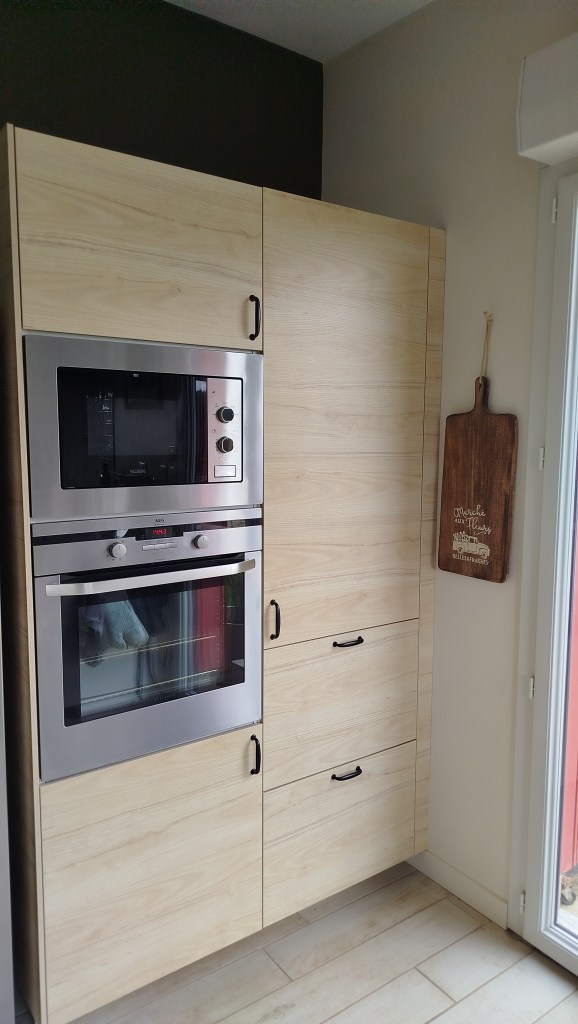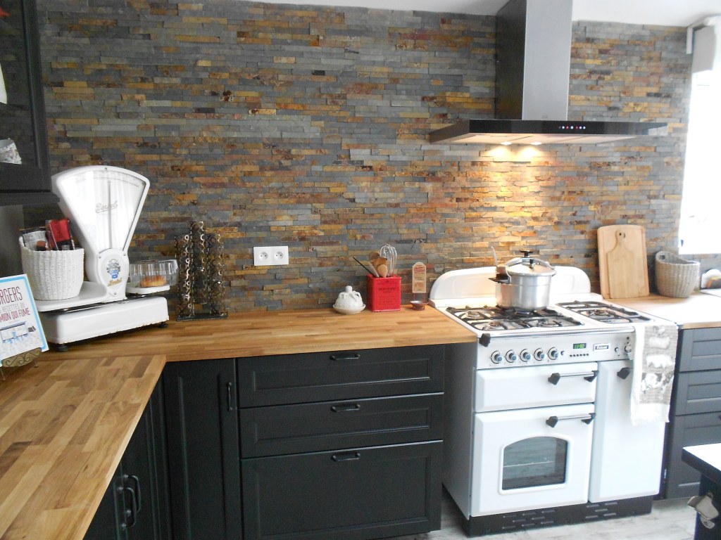 Cette cuisine se paraissait d’un style résolument industriel, de par les couleurs de façades et poignées noires, du plan de travail en chêne huilé et du piano de cuisson Falcon. Notre entreprise s’est occupée de la pose de la cuisine, des plaquettes de parement et de l’installation du piano de cuisson. Un îlot sur mesure a été créé par nos soins pour finir cette cuisine.