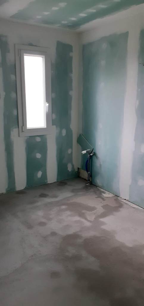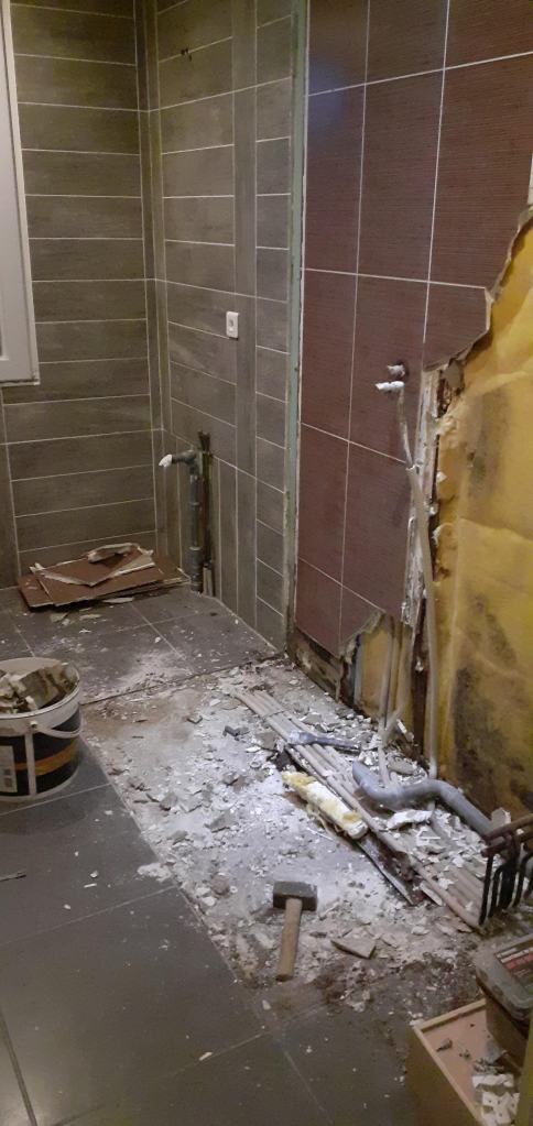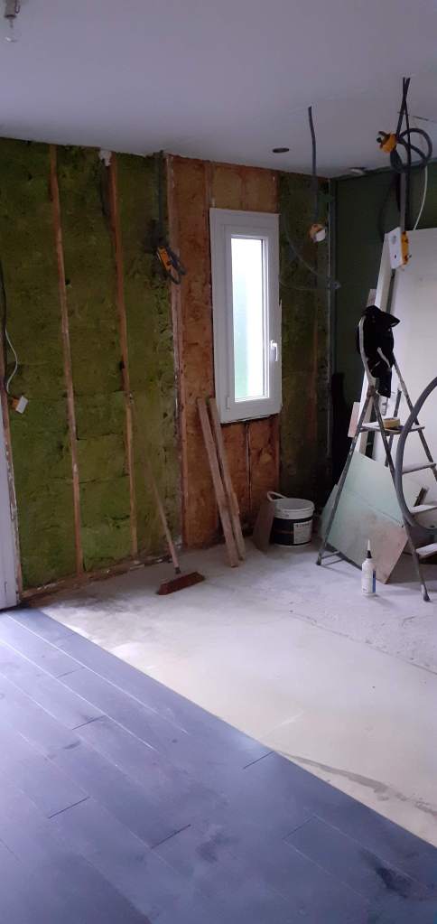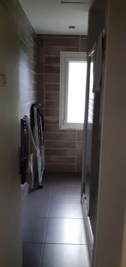 Cette salle de bain a subi de gros travaux de rénovation. Trop petite, il fallait l’agrandir, et les infiltrations d’eau nécessitaient de tout casser et refaire à neuf. Il a fallu changer des montants de l’ossature de la maison, attaqués par la moisissure, ainsi que l’isolation et les plaques de plâtre. Ensuite les bandes ont été refaites et les peintures, ainsi que le carrelage, la faïence et l’installation d’une douche à l’italienne. Le meuble vasque a été créé à partir d’une ancienne console.